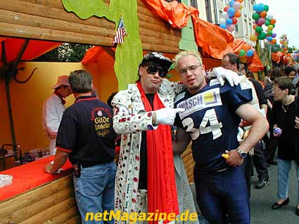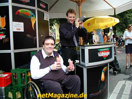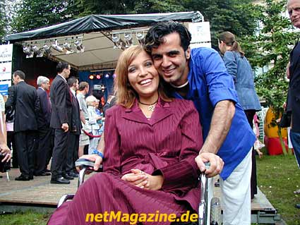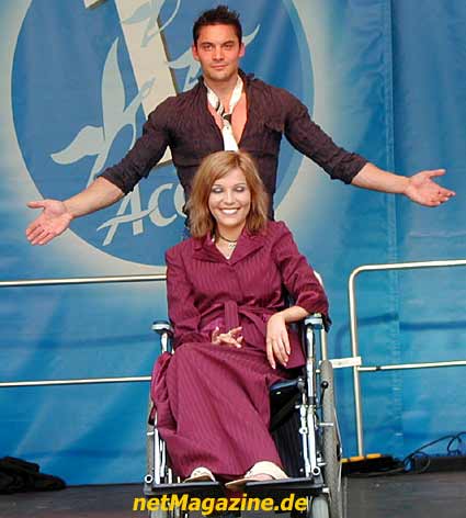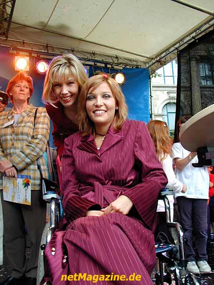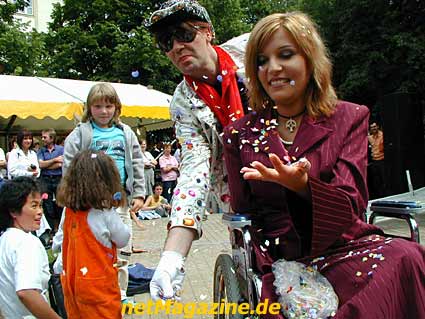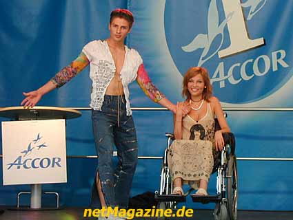 Der Glitterkönig begrüßt das Rollstuhlmodel Agata.