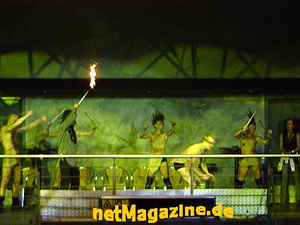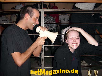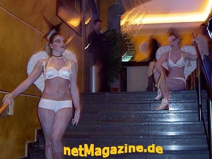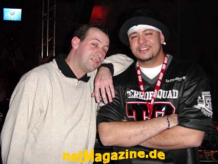 Fun2000 22.02.2003 " heavenly Saturday " himmlische Stimmung und höllische Party " Engel begrüßten die Gäste " NIMM DIE ZWEI !!! ziemlich laut hier ! ? DJ Sammy Sam (re.) Polonaise durch das DJ Pult Dance Performance EXIT netMagazine.de