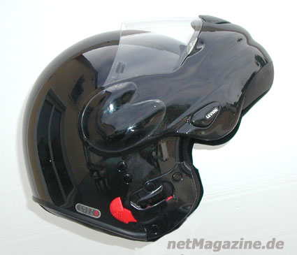 Anhand des roten Hebels kann der Helm aufgeklappt werdenPolycarbonat ist wie Xantar, Ronfalin, ABS, Lexan etc. ein